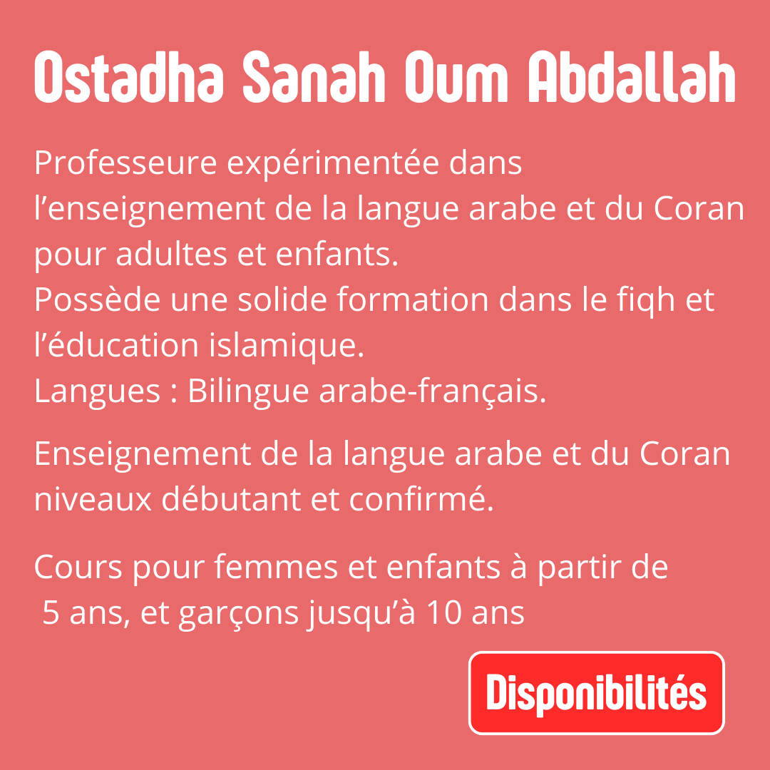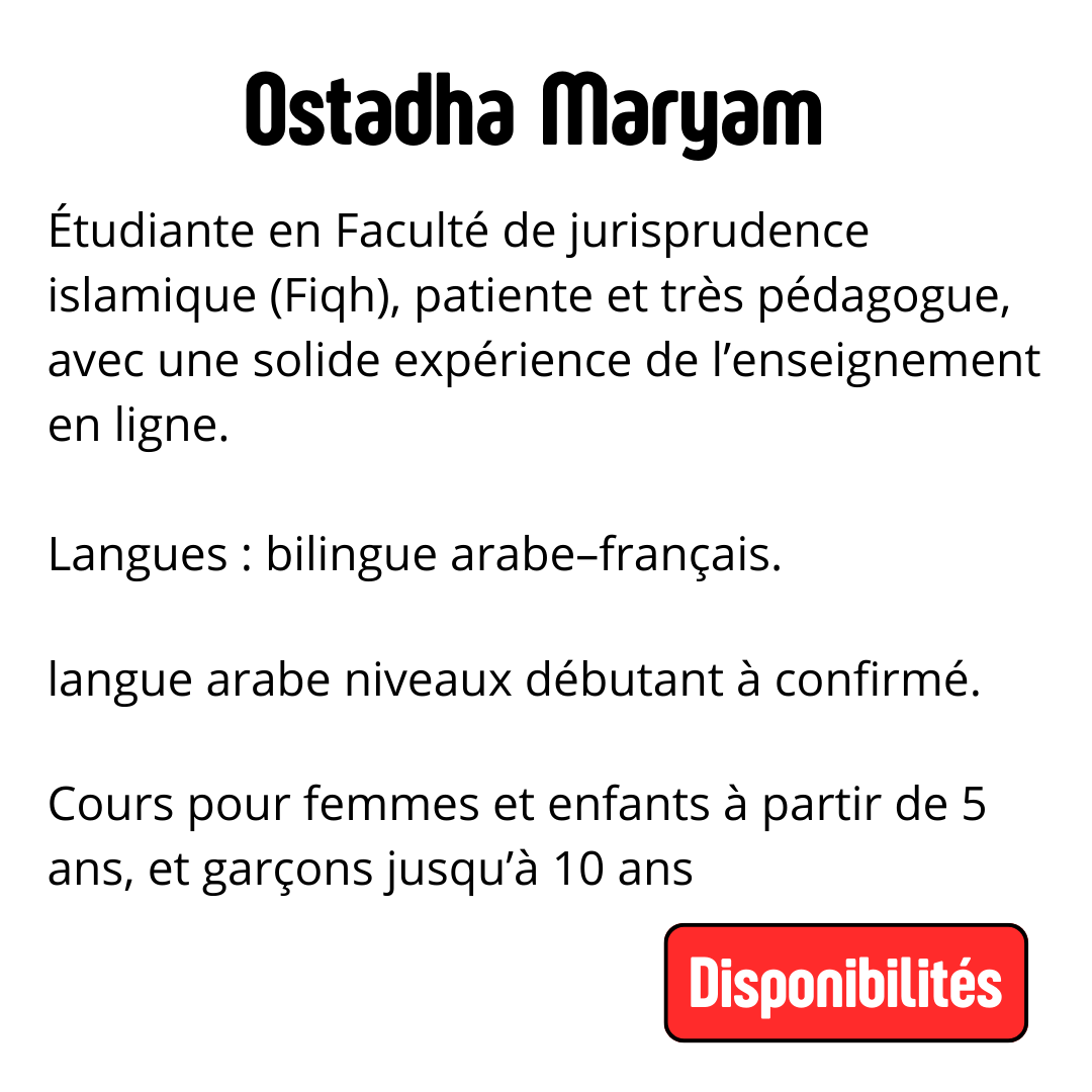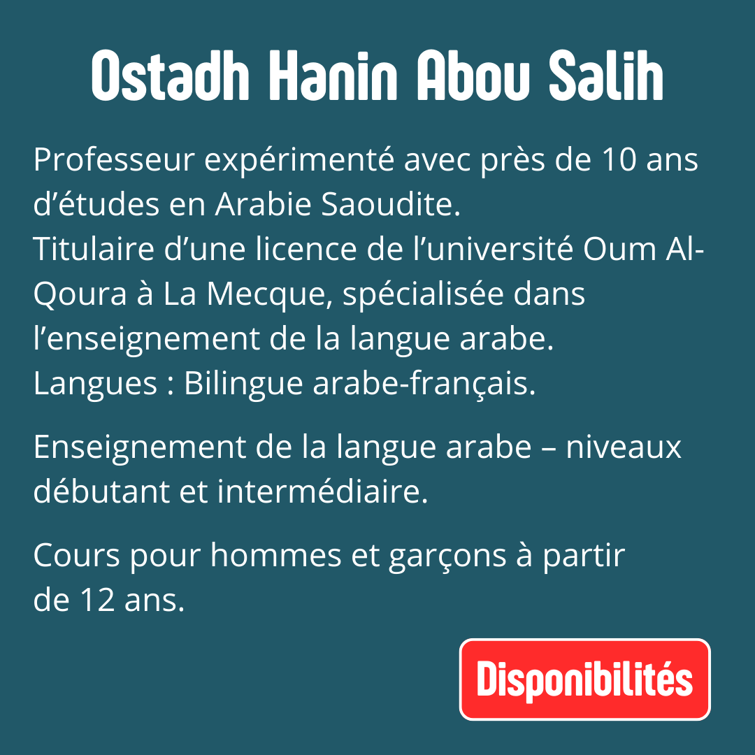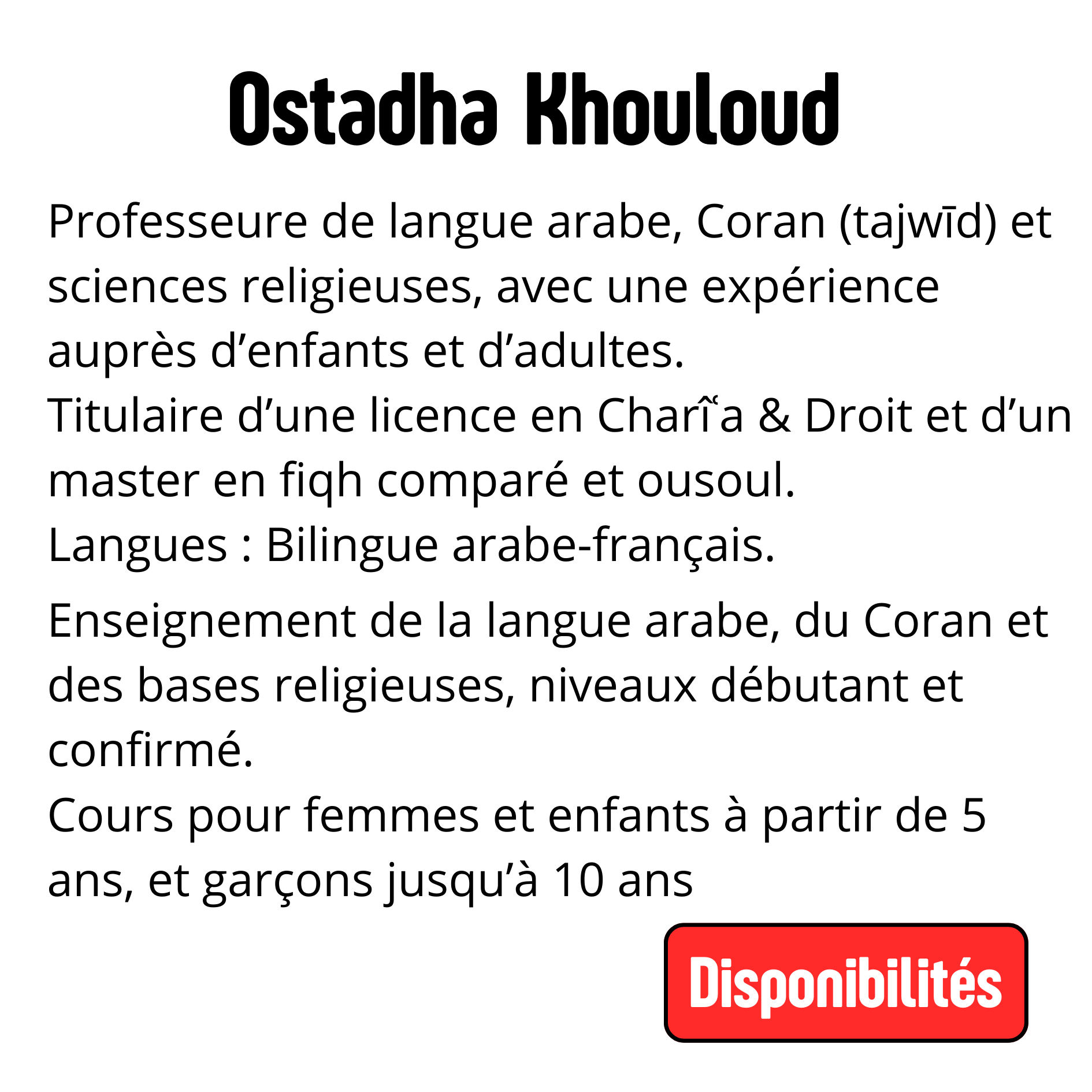 Nos enseignants et enseignantes sont qualifiés, expérimentés, et reconnus pour leur sérieux et leur pédagogie. Ils sont soit diplômés, soit dotés d’un parcours solide dans les sciences islamiques et la langue arabe, et maîtrisent parfaitement leur domaine d’enseignement.